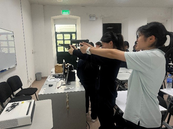 我校組織了17名參與“校園警星青年計劃”的同學前往澳門保安部隊高等學校參觀學習,深入了解保安高校的培訓體系及日常運作。在教官的安排下,同學們初步學習了槍械基礎知識,並親身體驗了持槍姿勢與操作技巧——從基礎持槍動作、瞄準方法,到實際扣動扳機的瞬間,每一個環節都讓同學們既感挑戰又興奮不已。隨後,大家參觀了耐力障礙訓練場、學員營房等設施,實地感受保安學員的培訓項目與在營生活。通過此次活動,同學們對紀律部隊的訓練模式與嚴謹作風有了更深體會,也對未來的升學方向有了更清晰的思考。