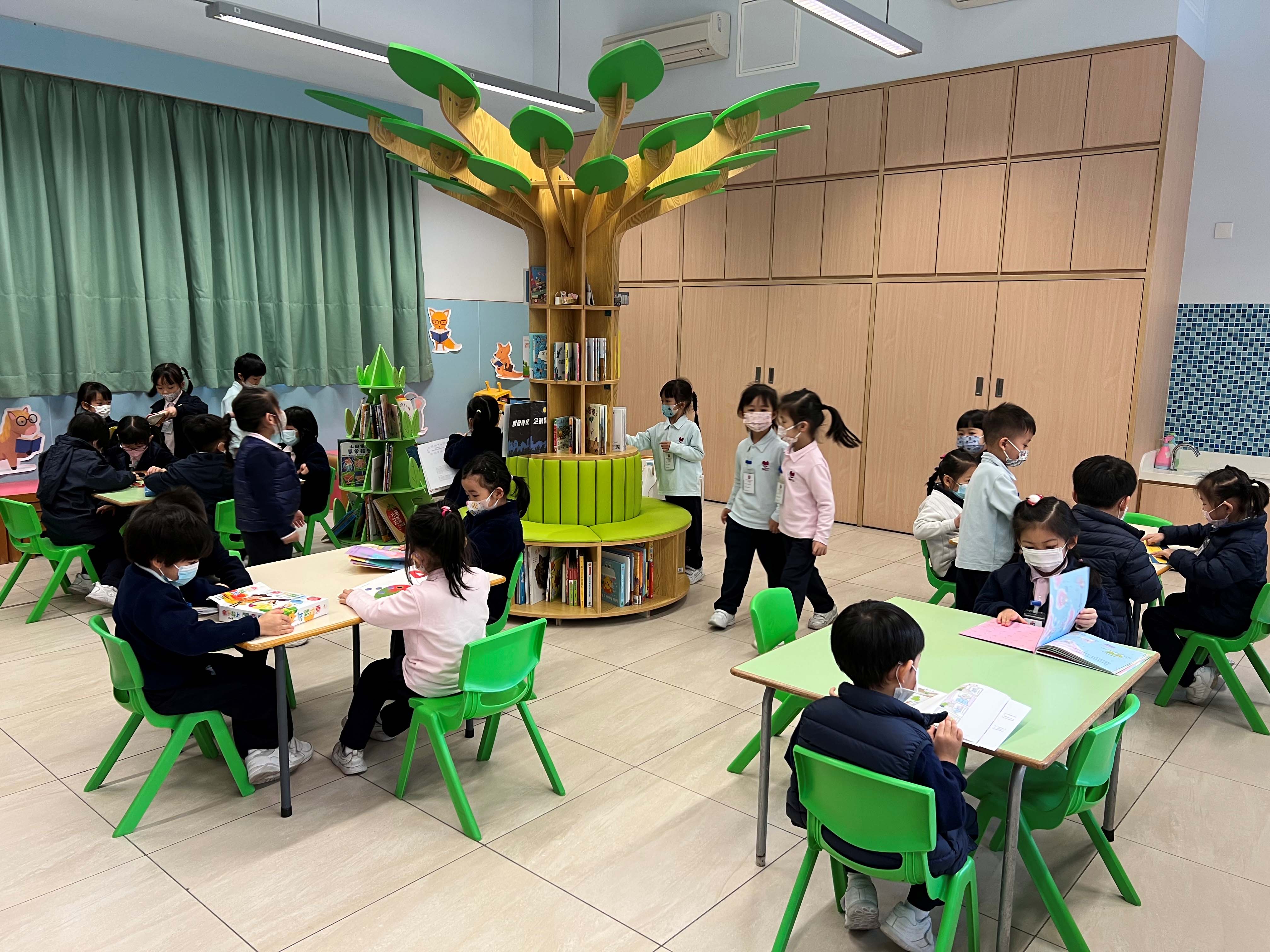 教學樓地下兩個課室設為圖書館,分別為閱讀圖書館及玩具圖書館,館內有很多不同形式的圖書,老師會在閱讀課時帶領學生參觀及閱讀,以培養學生閱讀興趣及能力;而在教學樓四樓亦增設了社會室及科學室,以配合課程主題,開展各項課堂的活動。